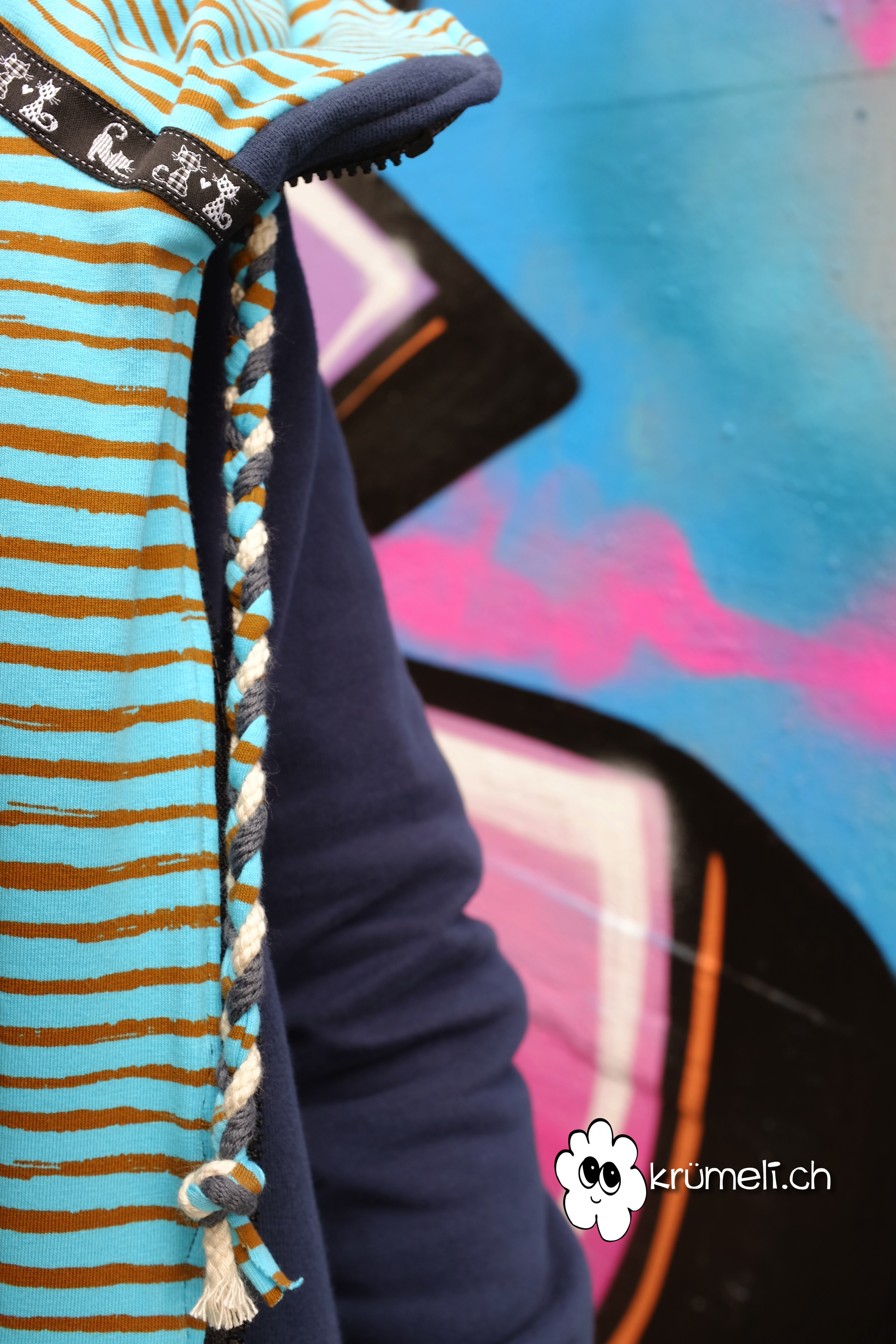 Die Kordel habe ich mit 2 dünneren Kordeln und dem gestreiften Stoff kombiniert.